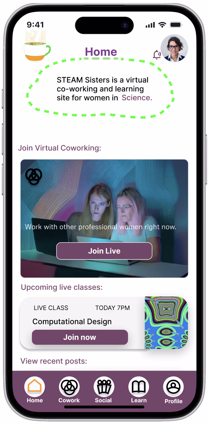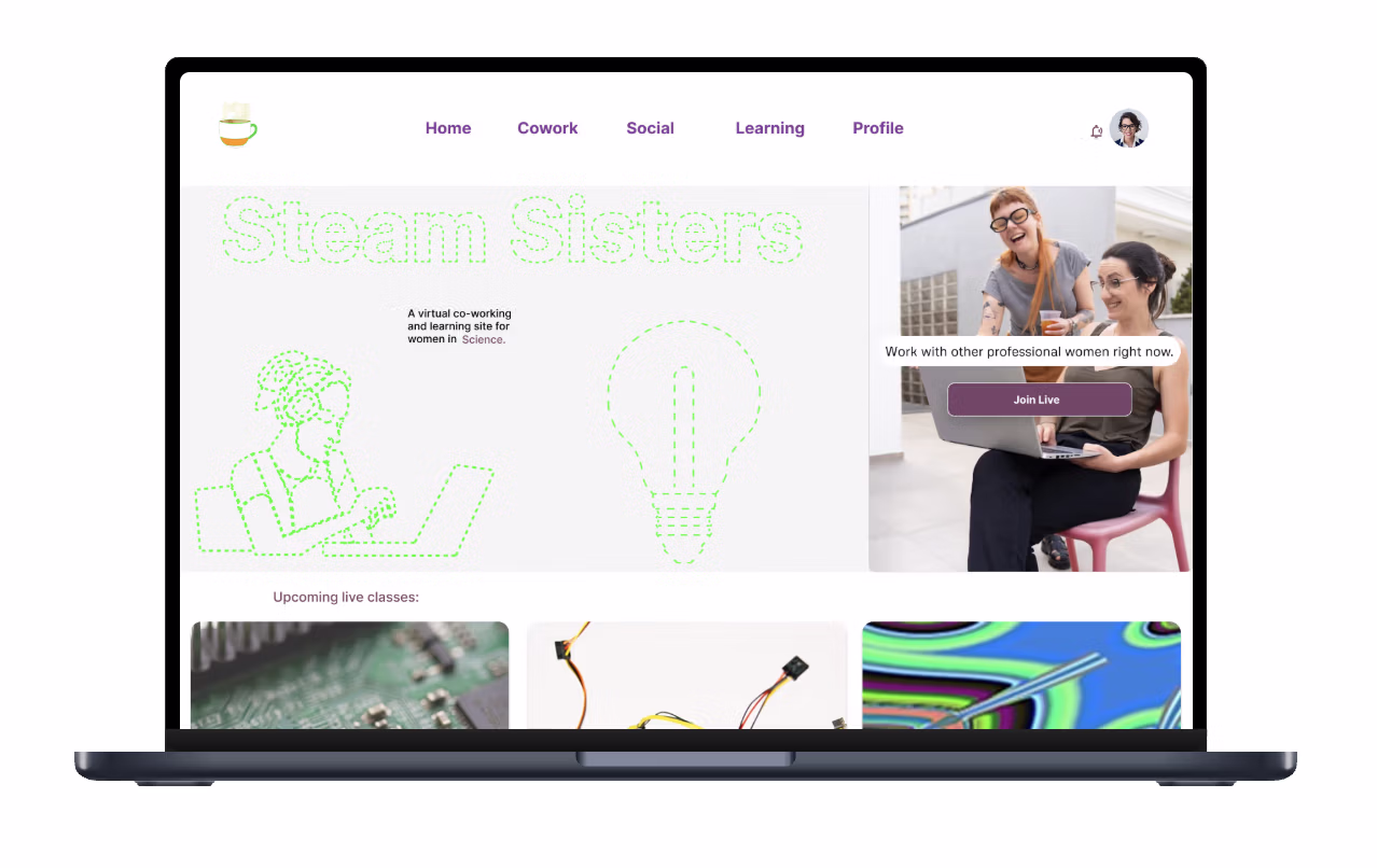 STEAM Sisters is a supportive digital community designed to empower women in Science, Technology, Engineering, Arts, and Math. The app brings members together through virtual coworking, mentorship, learning resources, and a vibrant social space-fostering connection, accountability, and personal growth in an inclusive, inspiring environment.