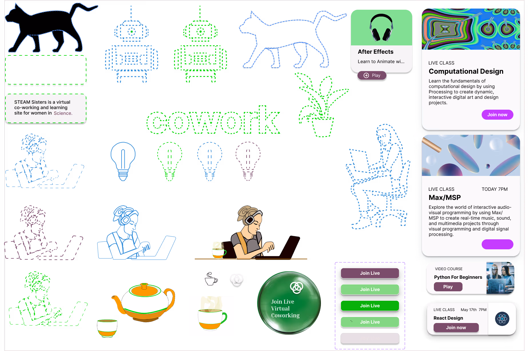 The character of STEAM sisters is meant to be fun, quirky, handcrafted, and joyful. STEAM stands for Science, technology, engineering, art and math, and Sisters for women, so symbols of these concepts were considered. Companionship is a delightful thing, as represented by tea, which we may be drinking while working on our projects in a supportive and unrestrictive environment. The idea of embroidery or stitching as a theme refers to the history of women's collaboration and shared productivity. I included some animations to make things more interesting.